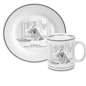 Product Description : : For more than 80 years The New Yorker's cartoons have been recognized for their style, wit, and intelligence. The New Yorker's cartoonists have created a truly American genre of art that has become an integral part of our cultural landscape. Konitz has teamed up with The New Yorker to bring these symbols of pop culture to tabletop. Pictured here is a business man on the phone at his desk in front of a window overlooking the city skyline and he says, "No, Thursday's out. How about never - is never good for you?" This dessert set includes one 13-ounce coffee mug and one 7.5 inch dessert plate. Mix and match with other pieces in the Konitz New Yorker collection to create a dessert set that will surely be the center of conversation with every use.